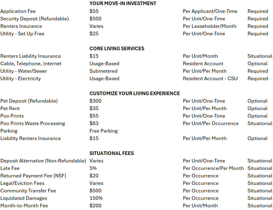 Below, you’ll find a simple breakdown of potential fees you may encounter as a current or future resident. We want you to have a clear picture of both upfront and ongoing costs so there are no surprises along the way.